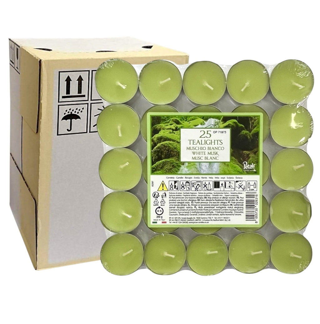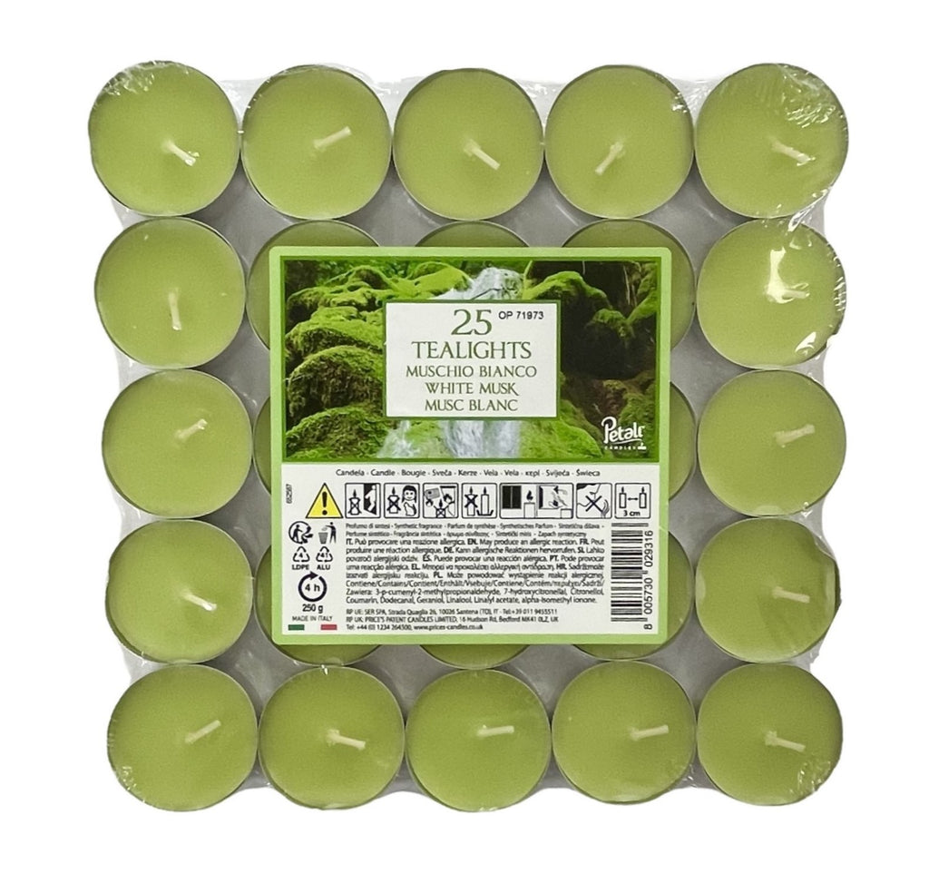 • Scented Τealights Pack of 25 SER Synthetic Fragrance 4hr Burning Time - White Musk Box of 17pcs