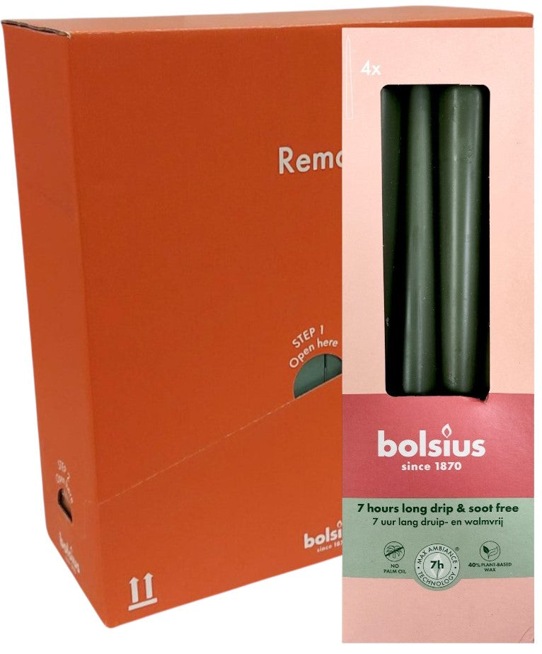 Κεριά Κωνικά Κηροπηγίου (Σπαρματσέτα) 245/24mm Bolsius 4άδα - Fresh Olive Κιβώτιο 8Τμχ